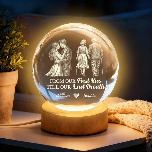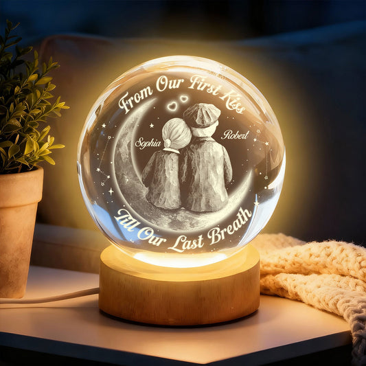 Eternal Embrace On The Crescent Moon - Personalized Wooden Base Crystal Lamp