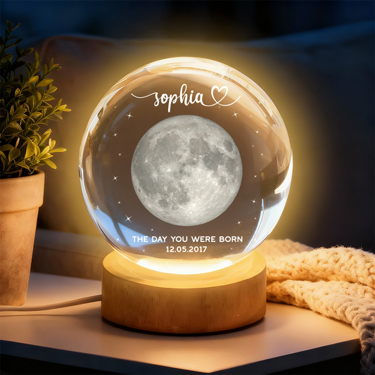 The Day You Were Born Moon Gift - Personalized Wooden Base Crystal Lamp