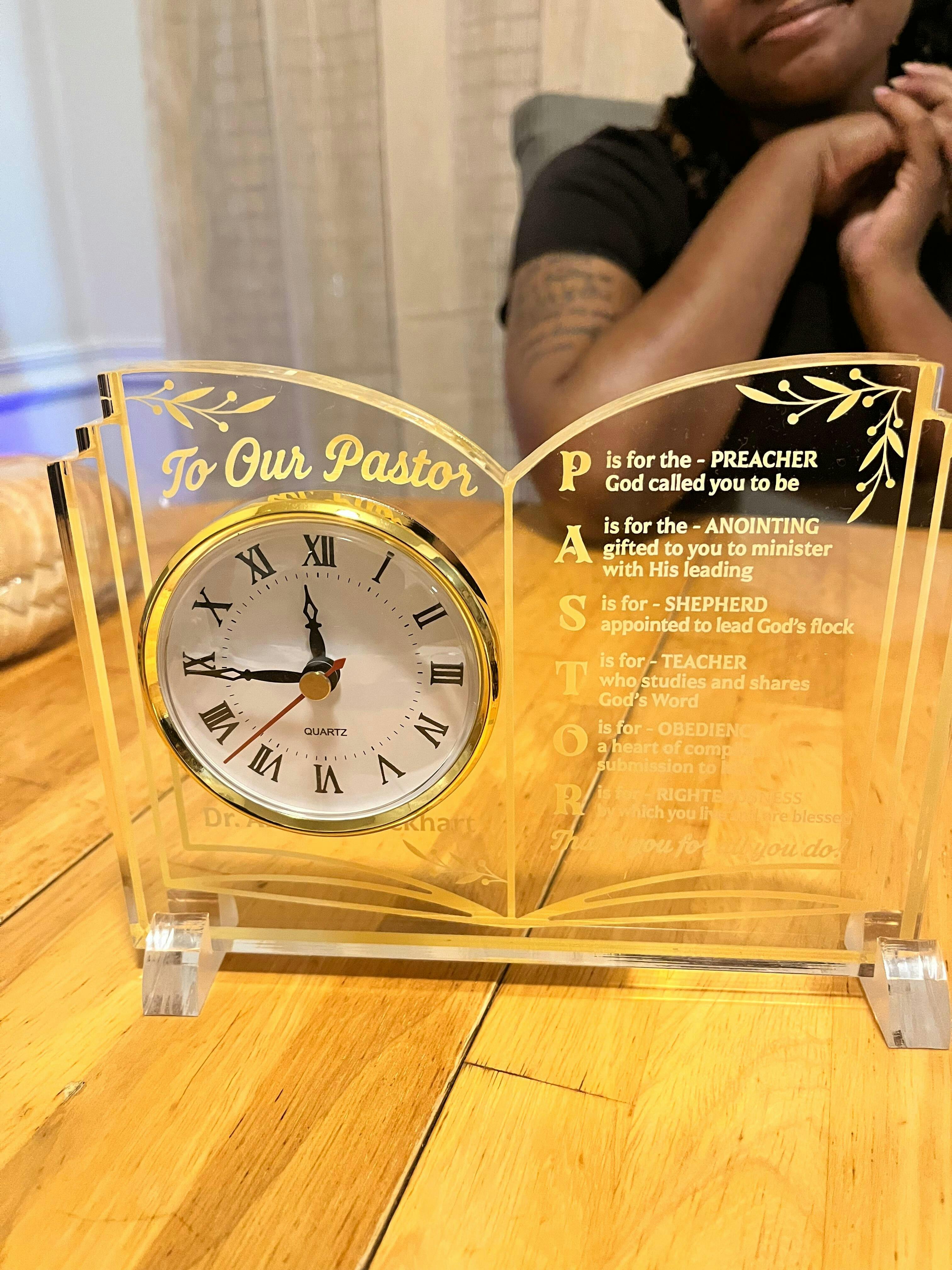 I am elated that you were able to put my church logo on the plaque. It is beautiful and I’m touched to be giving it to my pastor. Thank you so much.