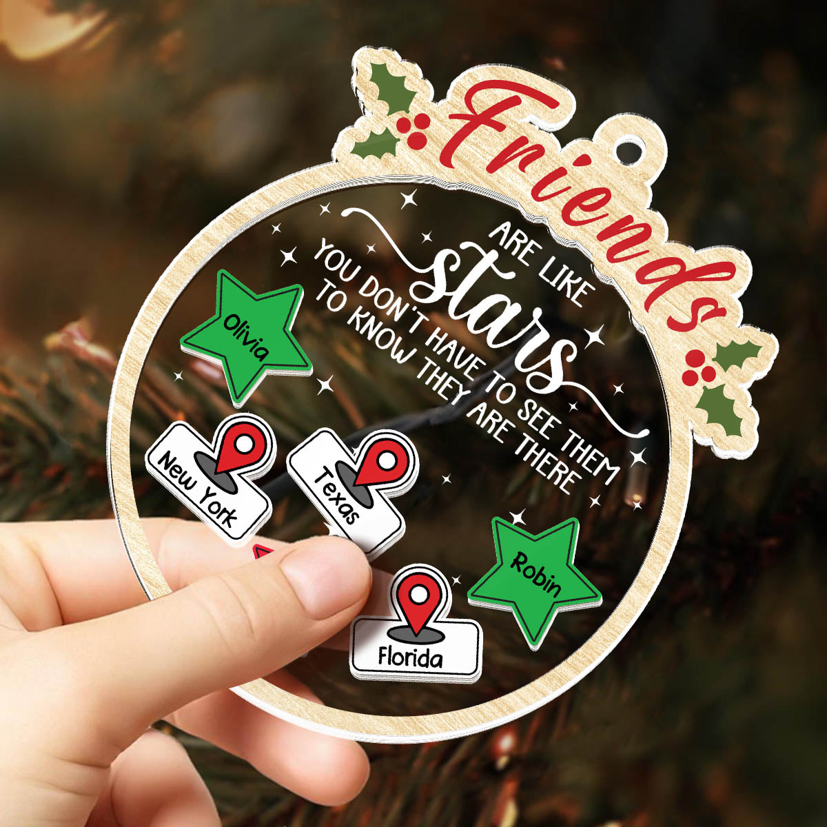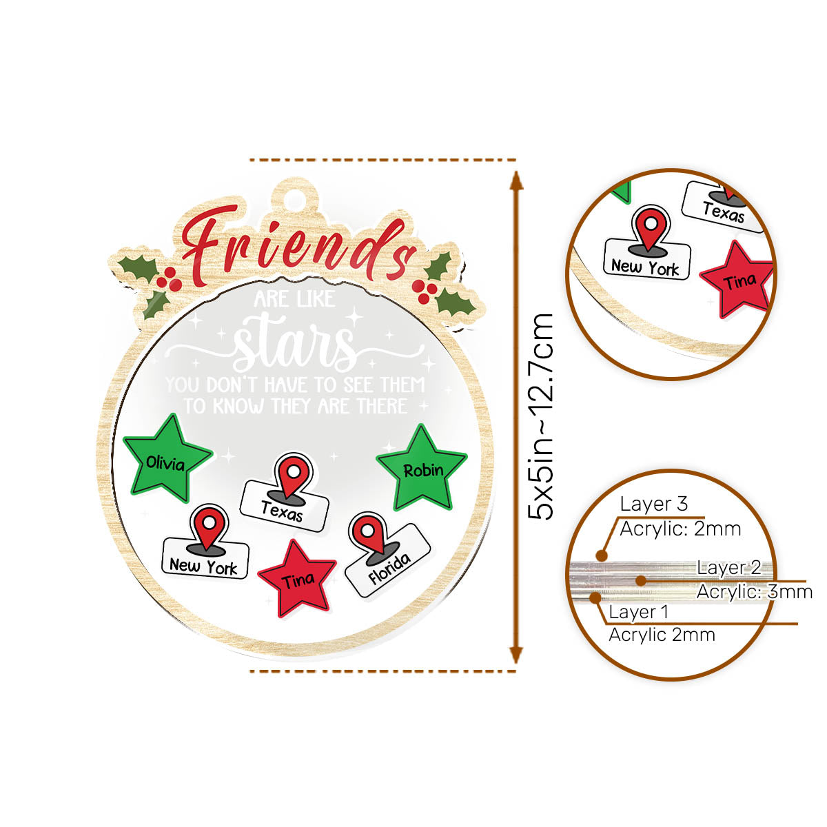 High-Quality Materials: Made from wood and acrylic, this ornament is both durable and lightweight, making it ideal for hanging on trees or decorating wreaths and garlands. Its multi-layered design often features classic Christmas motifs such as snowflakes, reindeer, Christmas trees or Santa Claus, giving it a nostalgic yet modern appeal.