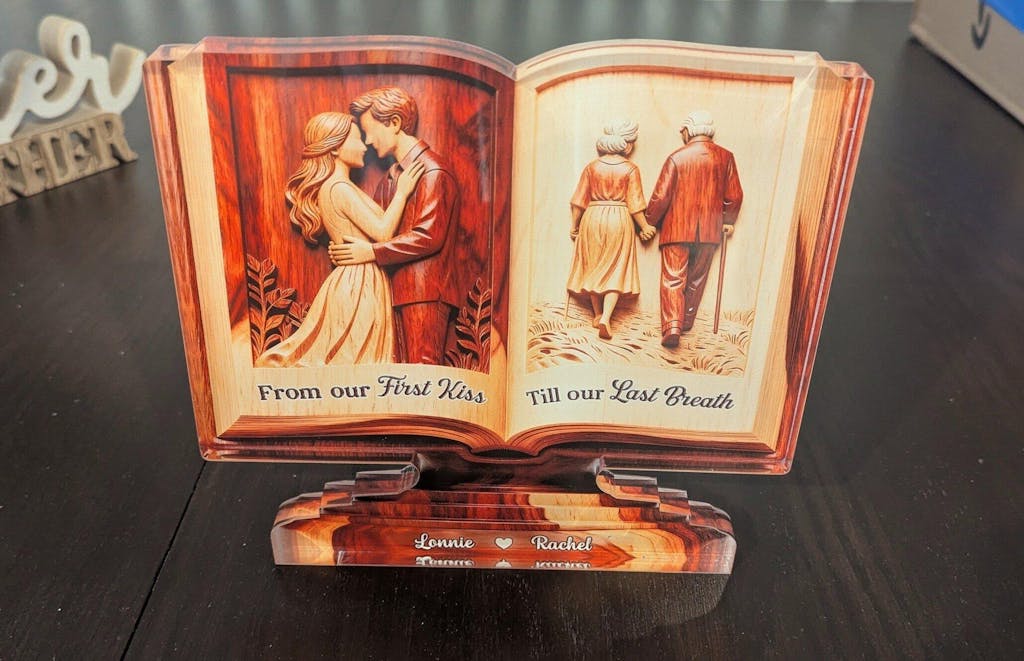 I love to see small businesses succeed, so I rarely ever complain. Just be aware that when the product arrives it does not look near as 'real wood' like as the pictures show. As you can see, it's very warm and reddish in color. It looks like it sets on a nice wide pedestal support. It doesn't, the entire plaque is about a half inch thick. If they would show a rear or side angle you could see that. About all you can do is lean it up against a wall or another item. Very disappointing, and I bought the largest size