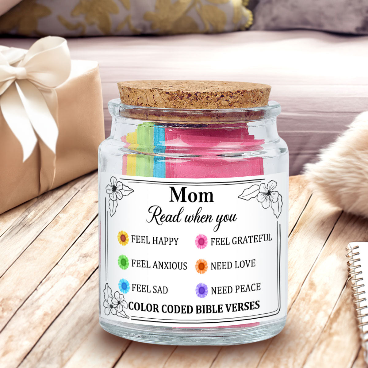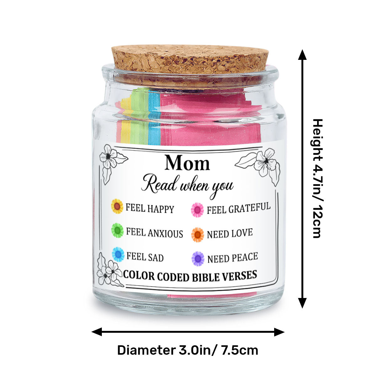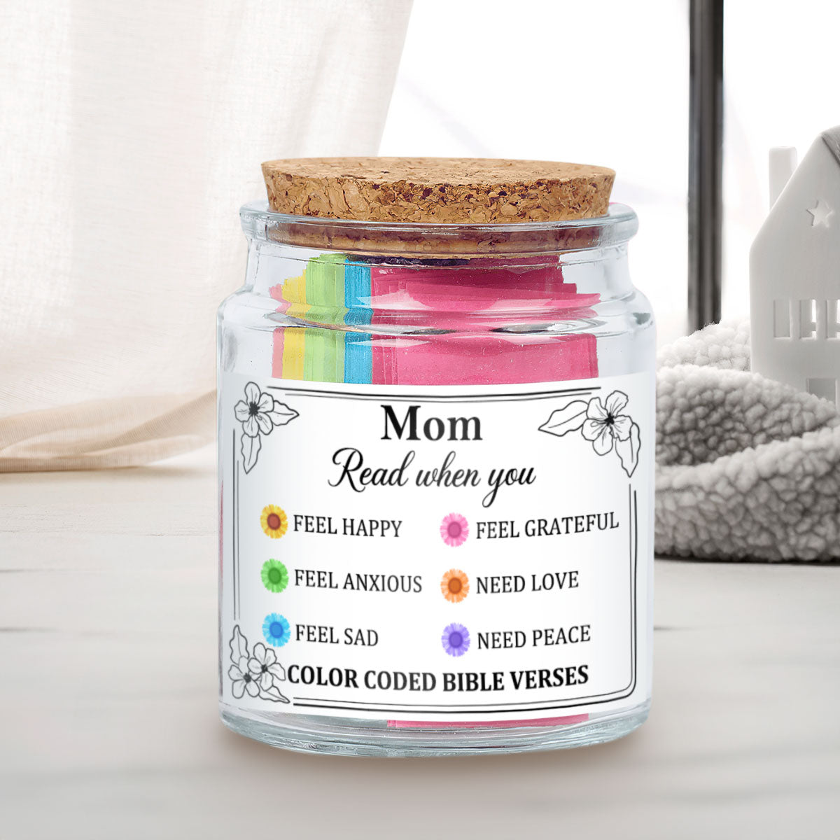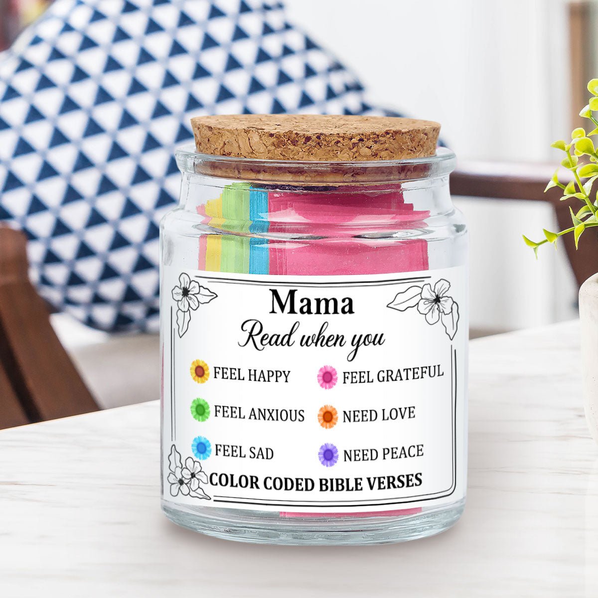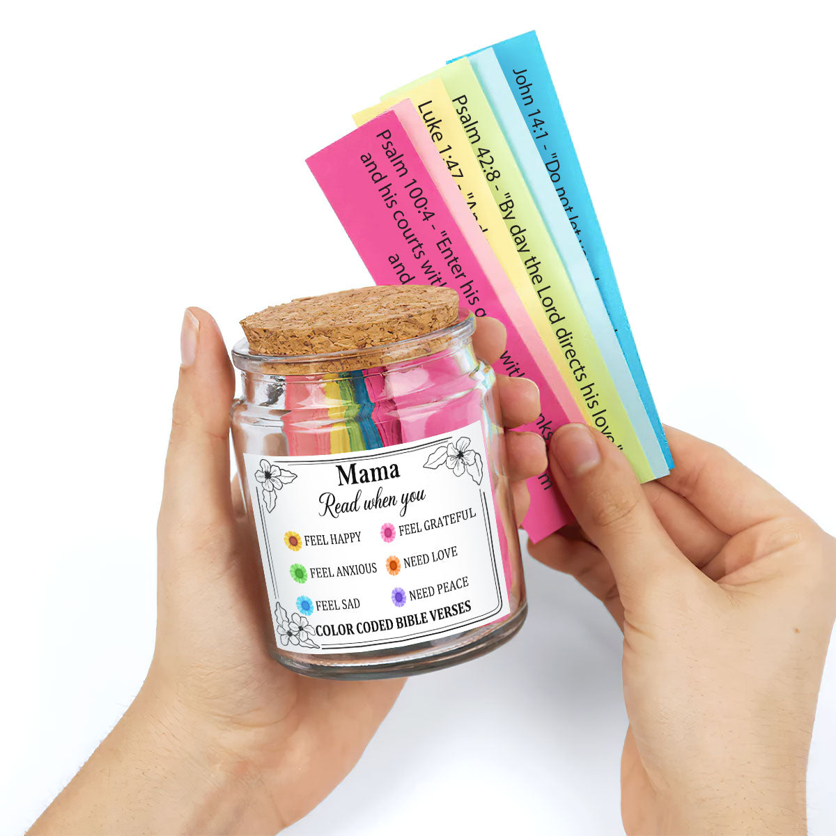 Find peace, strength, and inspiration in the Word of God with Our Bible Verse Jar For Mom. Thoughtfully designed, this jar contains color-coded Bible verses, each tailored to different emotions, offering encouragement in times of need. Whether she's feeling joyful, stressed, thankful, or anxious, simply pick a note to receive a message of faith and hope.