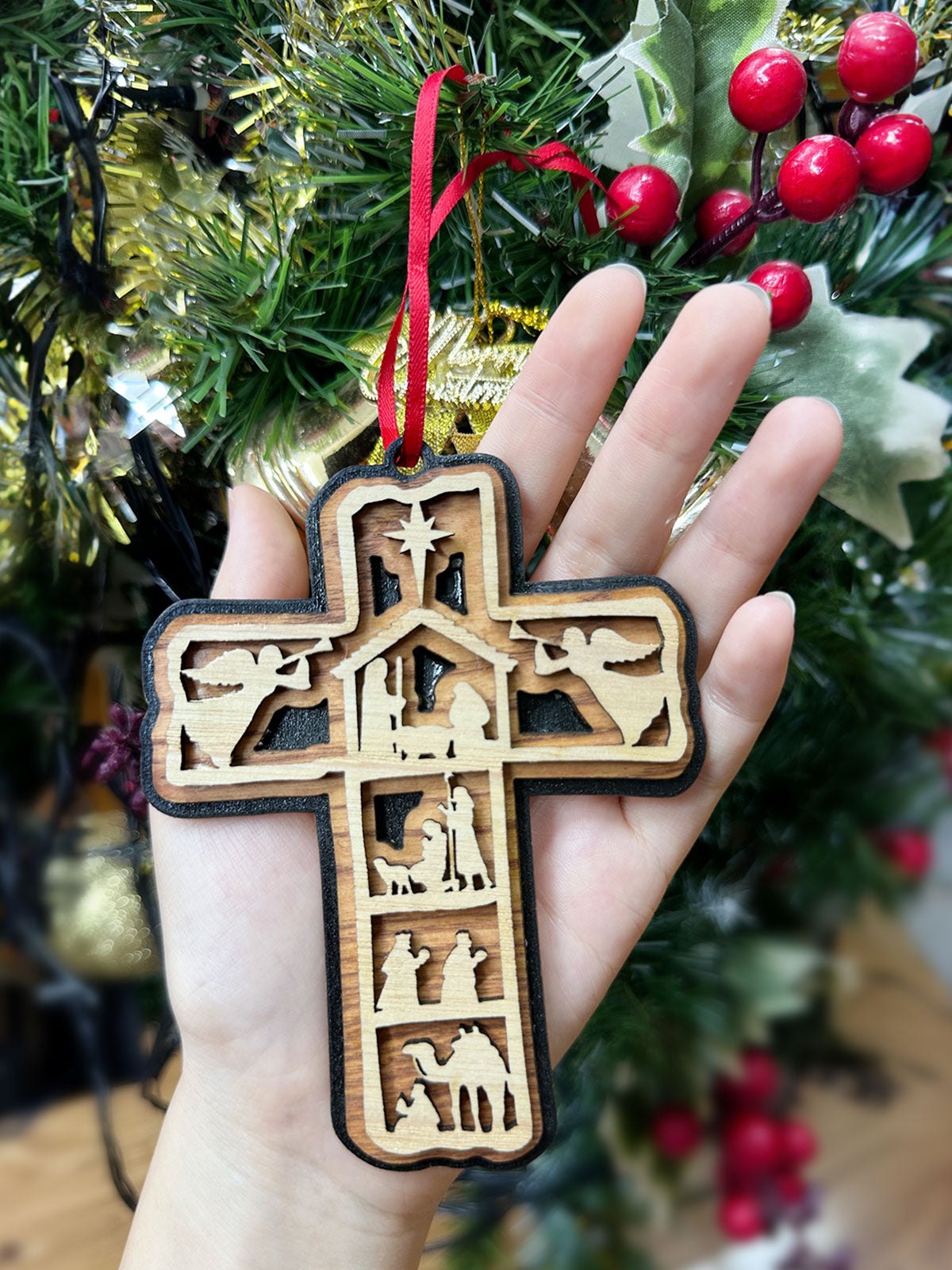 - Meaningful & Inspiring: Celebrate the true spirit of Christmas with this beautifully crafted 3-layered cross wood ornament, featuring a detailed Nativity scene.