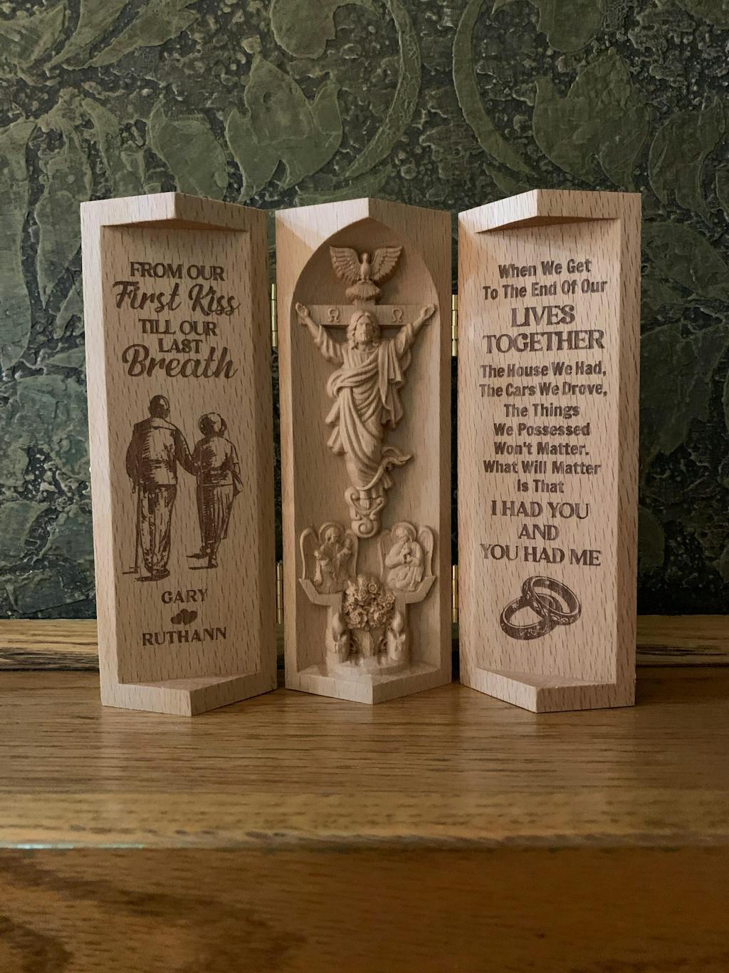 My wife loved the design of the and the unique beautiful sayings with our names on it! We love our lord and savior Jesus Christ and this was the perfect gift for us ❤️Thank you 🙏